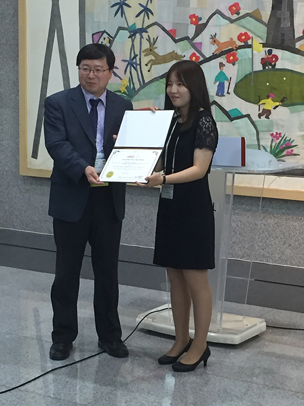 포스텍 전자과 경수정씨(지도교수 정성준) 전자전기공학과 대학원생 경수정 학생이(지도교수 정성준) 지난 8월 23-26일에 열린 국제정보디스플레이 학술대회(IMID2016)에서 발표한 ‘High performance 3D organic circuits fabricated by solution-process’ 내용이 우수포스터상을 수상하였다.