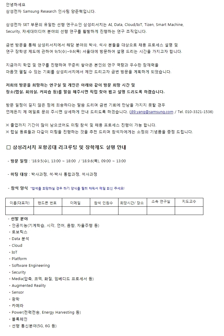 ■ R&D 채용 설명회 : 포항공과대학교 국제관 2층 중회의실(C/D) / 12:00 ~ 13:30 , 16:00 ~ 17:30 (총 2차례 진행)