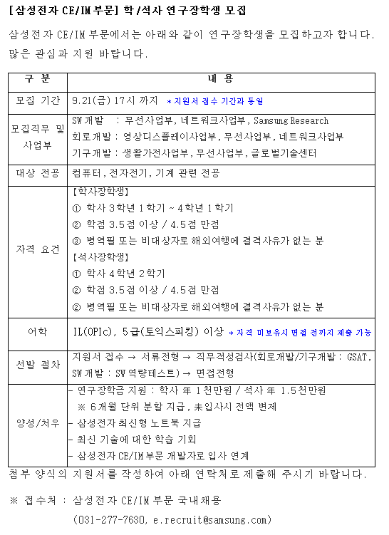 [삼성전자 CE/IM부문] 18년 하반기 학/석사 연구장학생 모집 안내