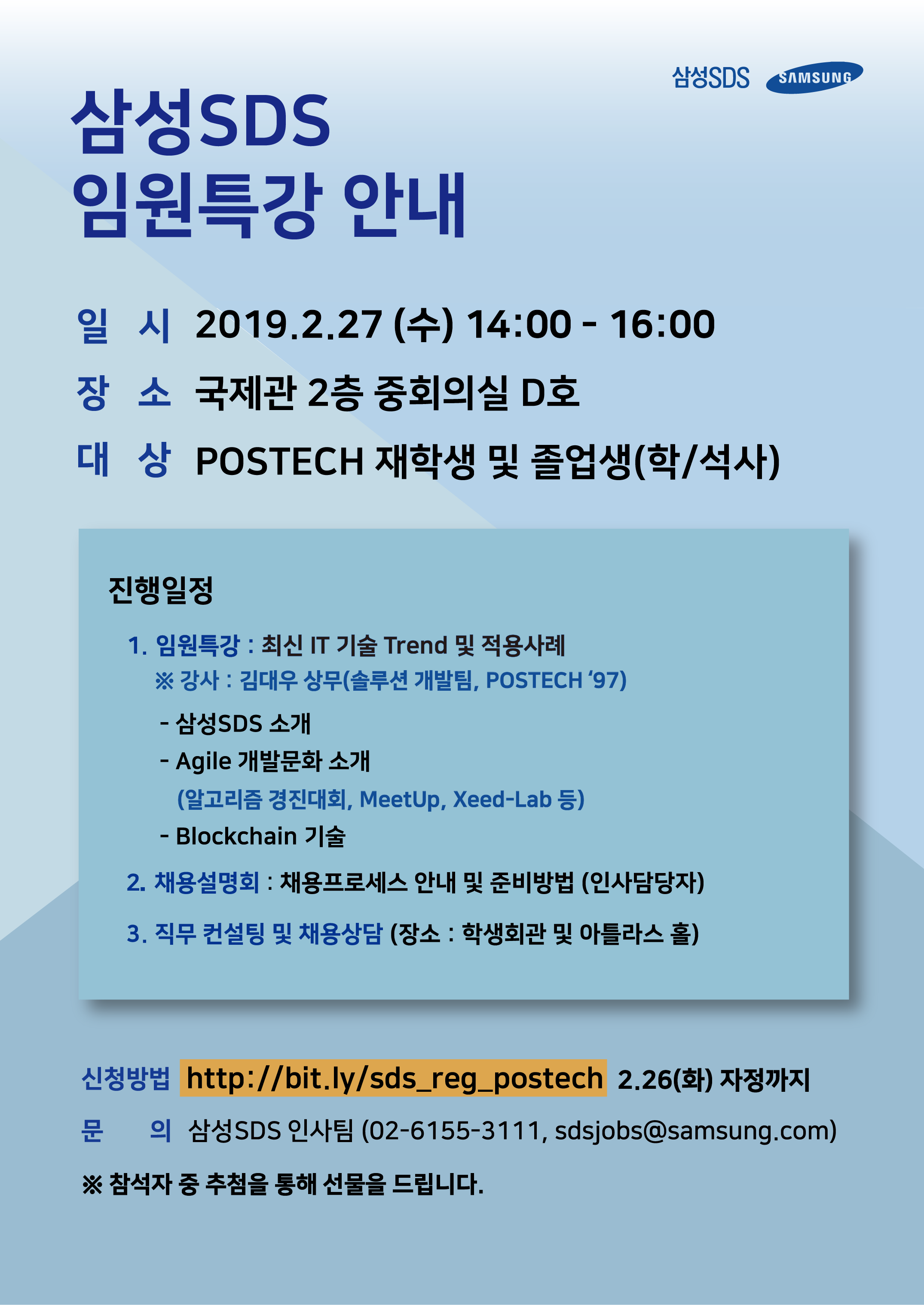 자세한 사항은 첨부 이미지 확인 후, 아래 URL을 통해 신청해주세요. ※ 신청 URL : http://bit.ly/sds_reg_postech