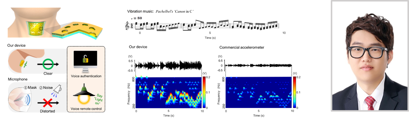 전자전기공학과 윤인열 학생(정윤영 교수 연구실)이 화학공학과 조길원 교수 연구팀과 함께 진행한 공동 연구를 통해 기존 마이크보다 훨씬 민감도가 높으면서 피부에 편리하게 부착하여 사용 가능한 “피부 부착형 고성능 진동 센서”를 개발하였으며, 연구 결과는 세계 최고 권위의 Nature Communications 6월 18일자 온라인판에 게재되었다.
