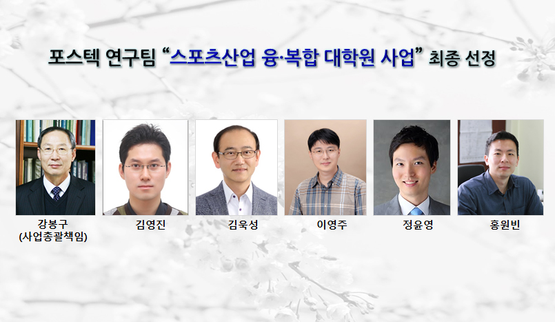포스텍 ‘전자컴퓨터융합공학부’와 ‘스포츠산업지원센터’를 주축으로 구성된 연구팀(사업총괄: 강봉구 교수/전자컴퓨터융합공학부 학장)이 문화체육관광부에서 주관하는 스포츠산업 융·복합 대학원 사업에서 전국 14개 대학의 높은 지원 경쟁률을 뚫고 최종 선정 되었다.