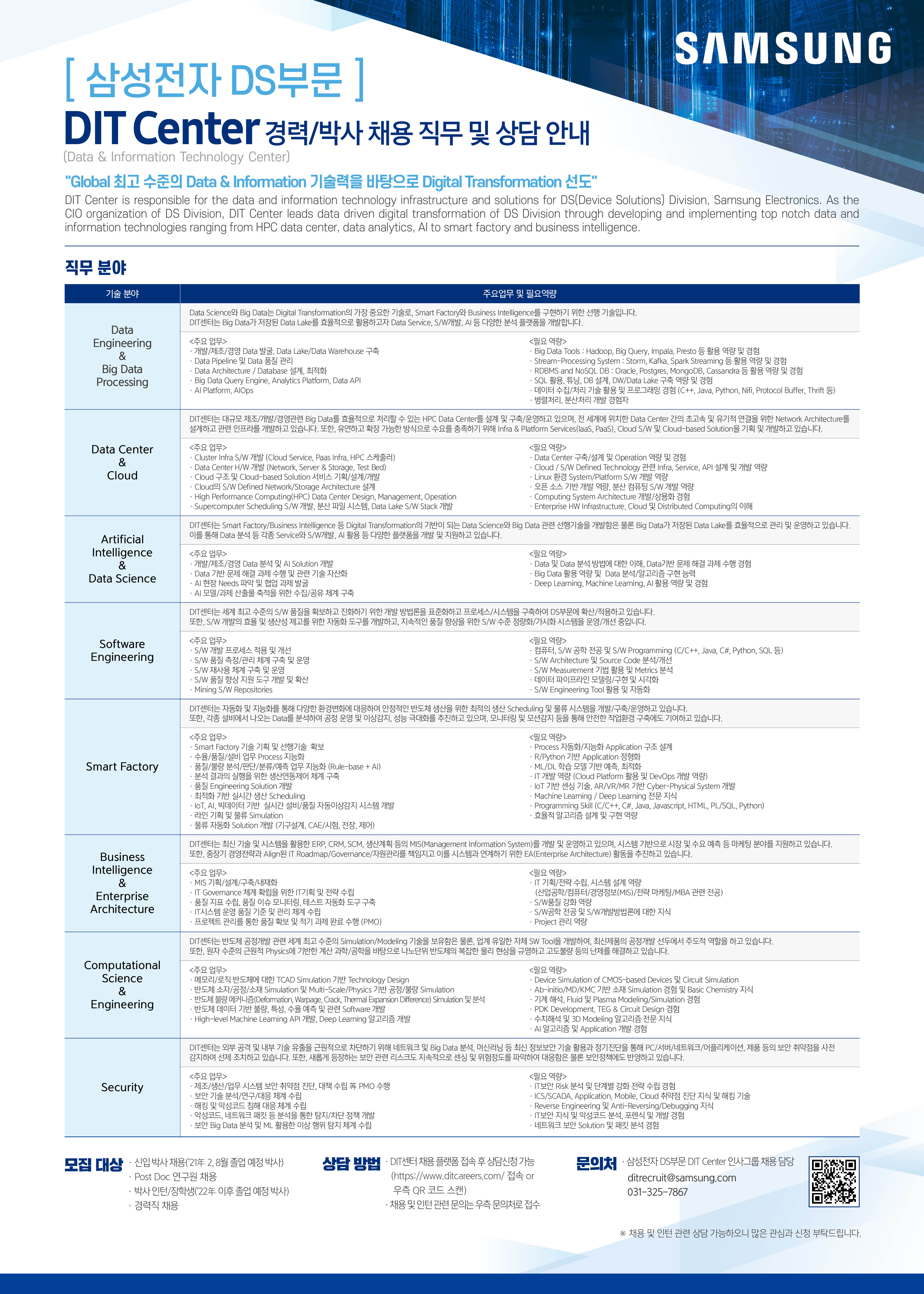 DIT센터는 Data & Information Technology Center의 약자로 DS부문의 CIO 역할을 하며 Global 최고 수준의 Data & Information 기술력을 바탕으로 Digital Transformation을 선도하고 있습니다.