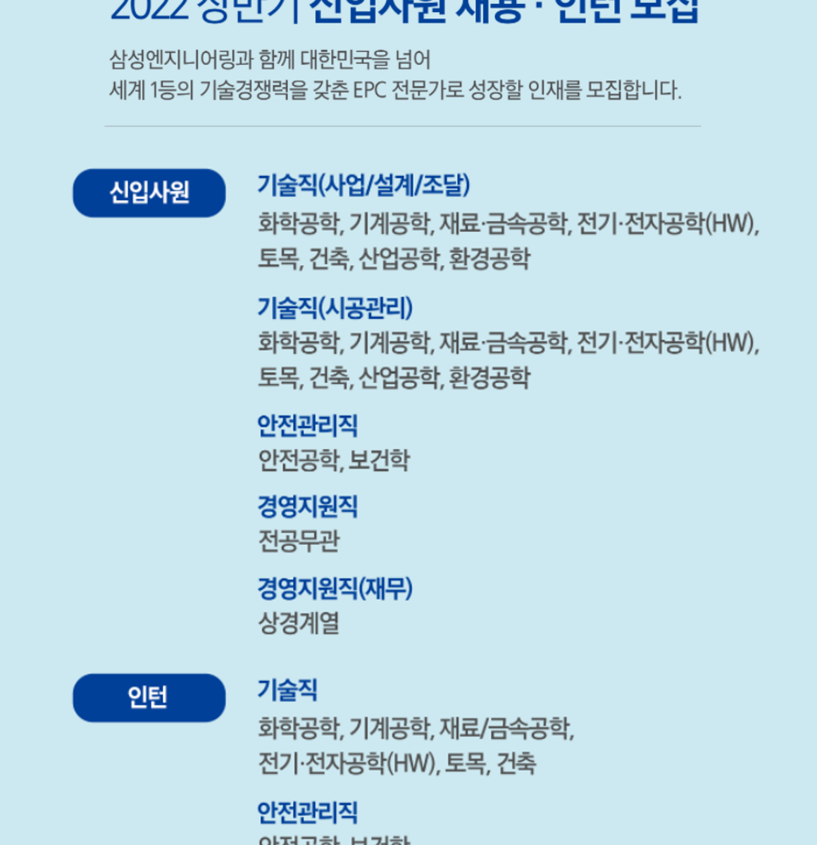 삼성엔지니어링과 함께 대한민국을 넘어 세계 1등의 기술경쟁력을 갖춘 플랜트 전문가로 성장할 인재를 모집합니다.