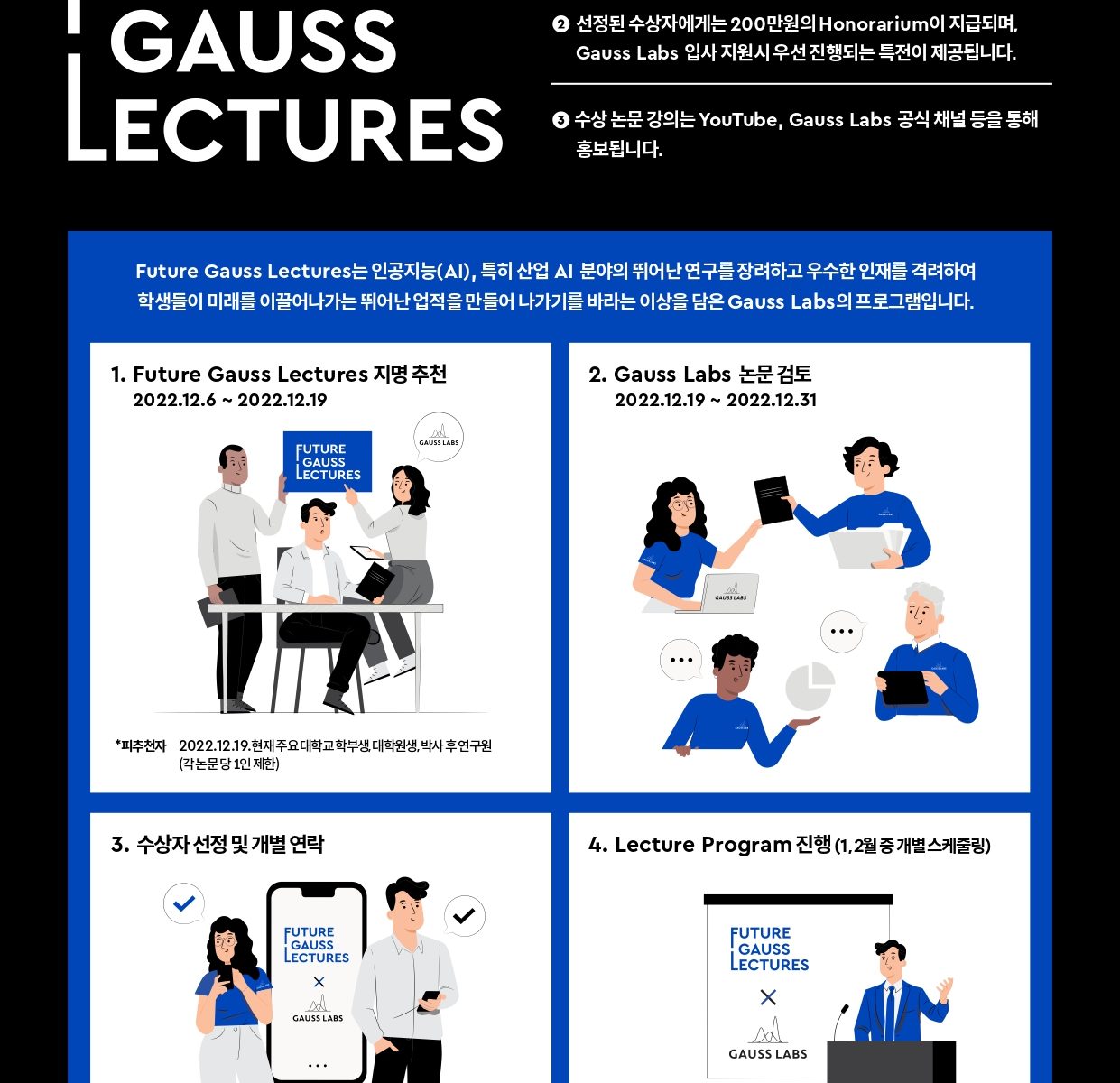 • 이후 Gauss Labs에서는 접수된 논문을 검토하여 소수의 수상자를 선정하고 개별 통보 후 Lecture Program을 진행합니다.