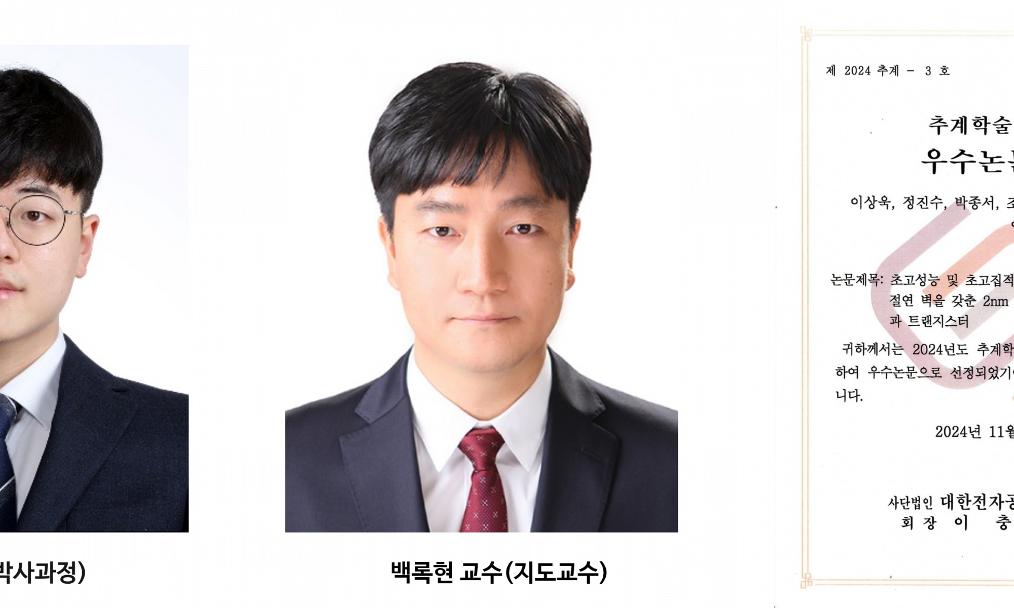 포스텍 전자전기공학과 박사과정 이상욱 학생 (지도교수: 백록현 교수)이 대한전자공학회가 주관하는 ‘2024추계학술대회’에서 “초고성능 및 초고집적이 가능한 패턴 유전체 절연 벽을 갖춘 2nm 노드 나노시트 전계 효과 트랜지스터” 논문을 발표하여 우수 논문상 (상금: 100 만원)을 수상하였다.